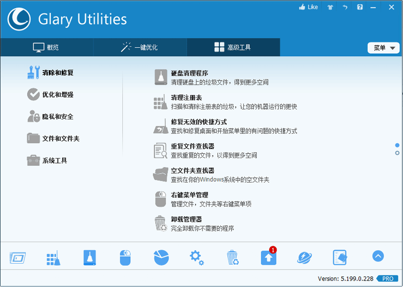 Glary Utilities是一款免费系统清理与优化工具,是一系列系统工具集合,能够修理、加速、增强和保护你的PC机。它允许你清理系统垃圾文件,无效的注册表键值,上网记录等。支持简体中文等多语系界面。在安装时会自动选择简体中文界面,还可免费在线升级。